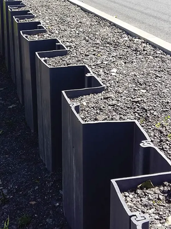 Están hechas de cloruro de polivinilo resistente, modificado con agentes refinadores (por ejemplo, modificadores de dureza, estabilizadores térmicos y UV y componentes de relleno mineral) y reforzadas con fibra de vidrio. Los perfiles se fabrican mediante el método de moldeo por extrusión como perfiles monolíticos. Gracias al uso de este método de reciclaje de ciclo cerrado, las tablestacas de vinilo y las tablestacas híbridas (reforzadas con fibra de vidrio) son una solución respetuosa con el medio ambiente.